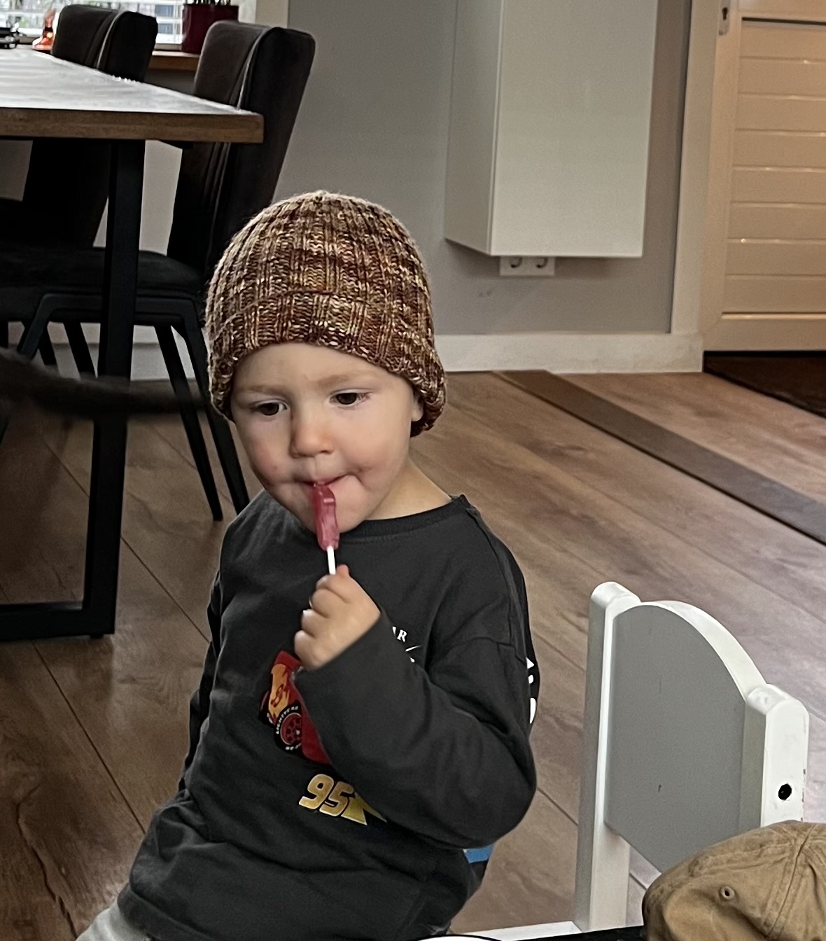 Voor Dieks ben ik er ook een aan het breien en hij moest deze even passen zodat ik kon meten hoe hoog ik die van hem moet breien.