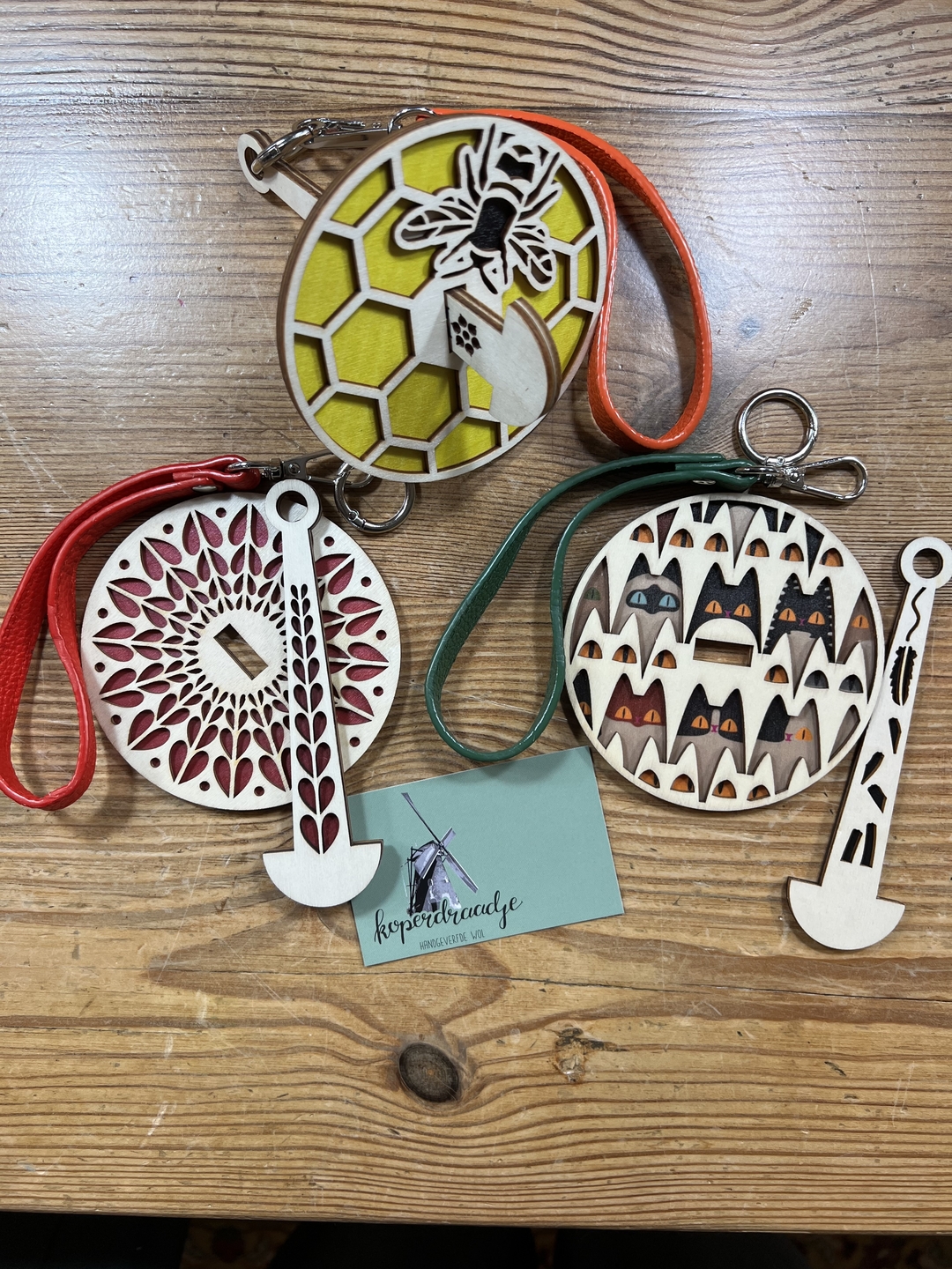 Leonie staat achter de kraam waar jullie haar prachtige hand gemaakte projecttassen en naalden etuis kunnen bewonderen en kopen.