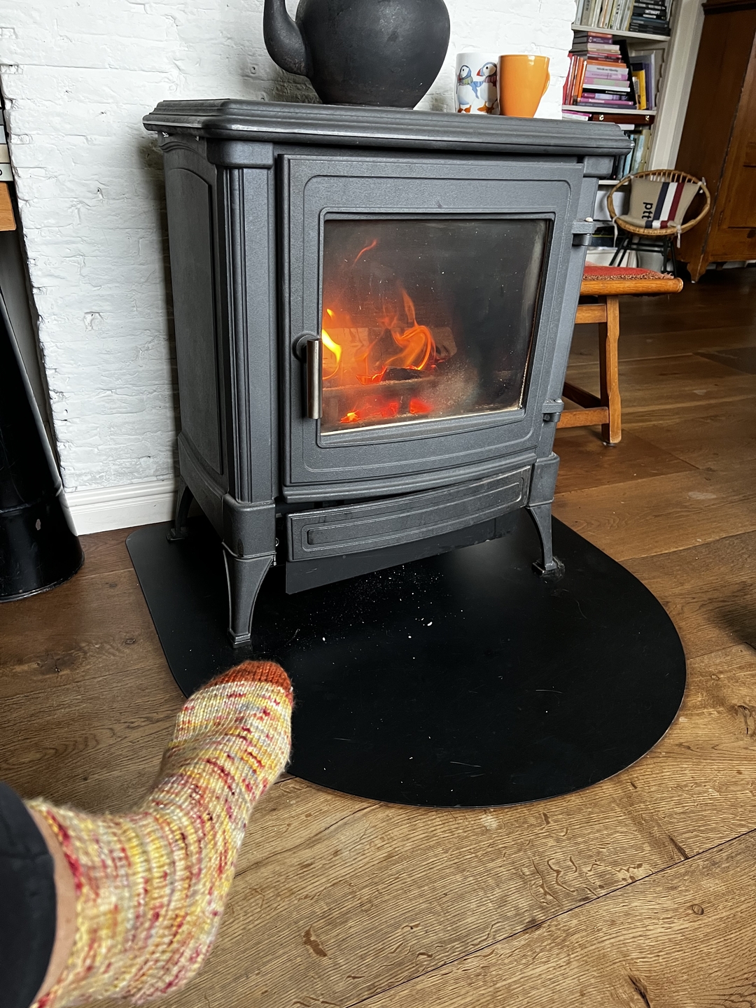 Dit is dan mijn favoriete plekje, kachel aan, warme voeten en breien!