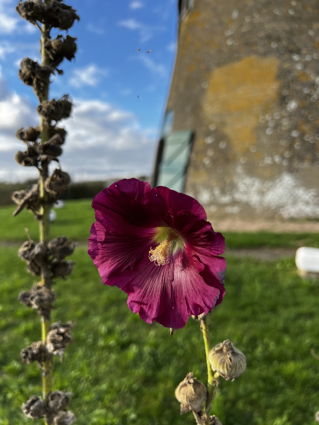 Buiten is de stilte voor de storm, een bleek zonnetje schijnt er en ik zie nog een laatste bloem in de niet afgeknipte stokroos.