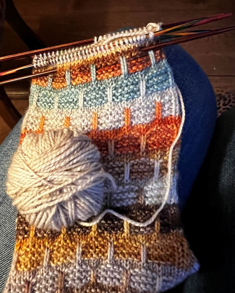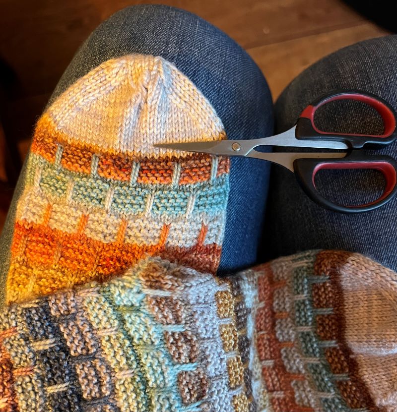 Neemt met dunnere naalden de steken weer op en breit een nieuwe teen aan de sok.
