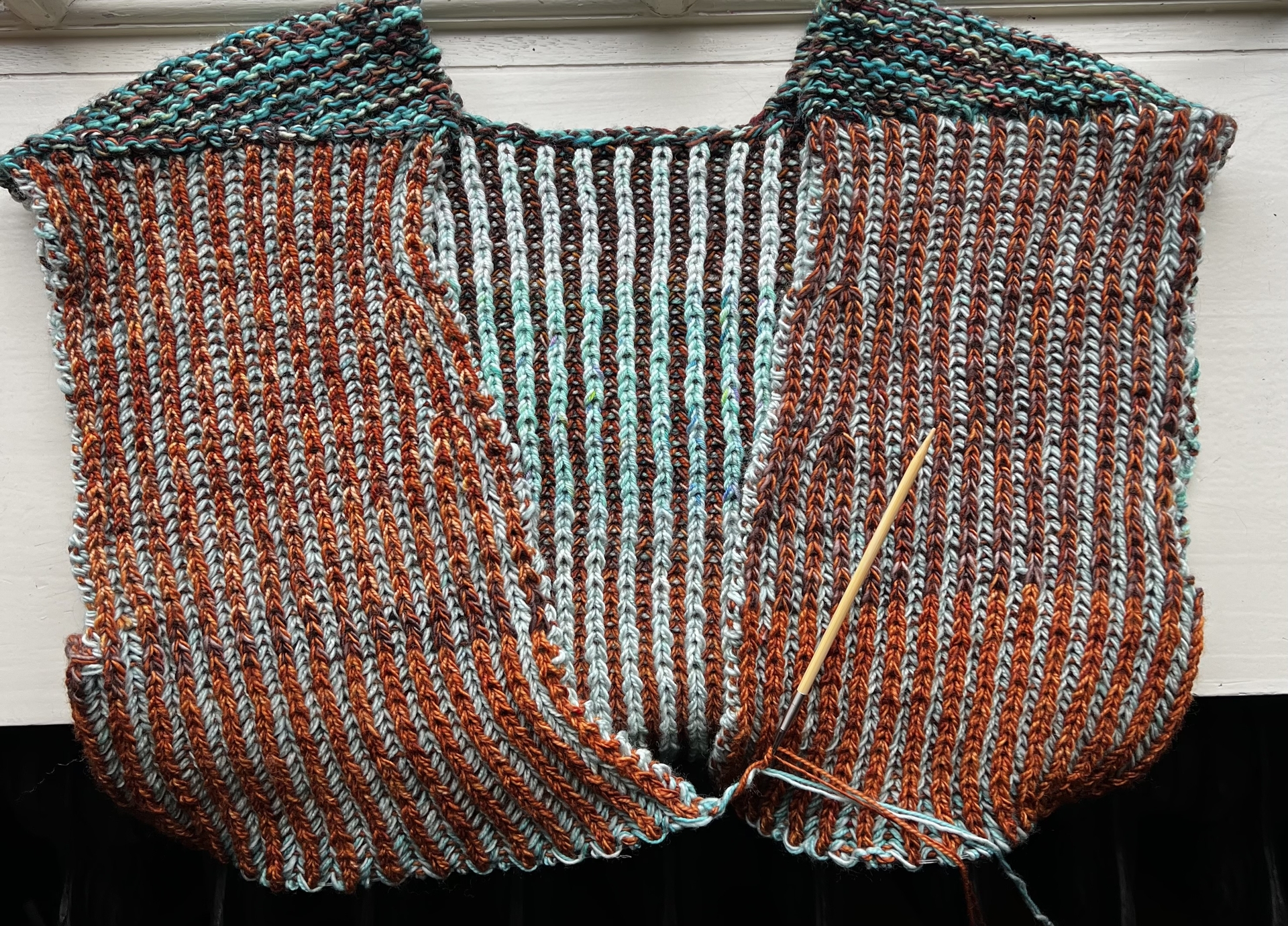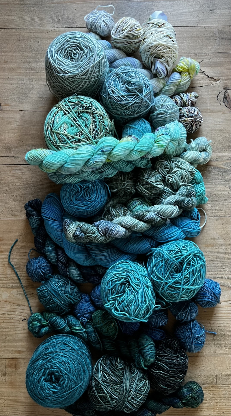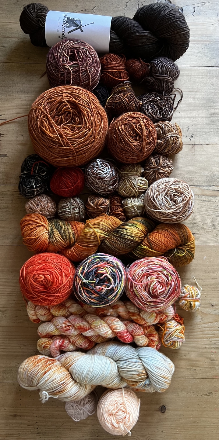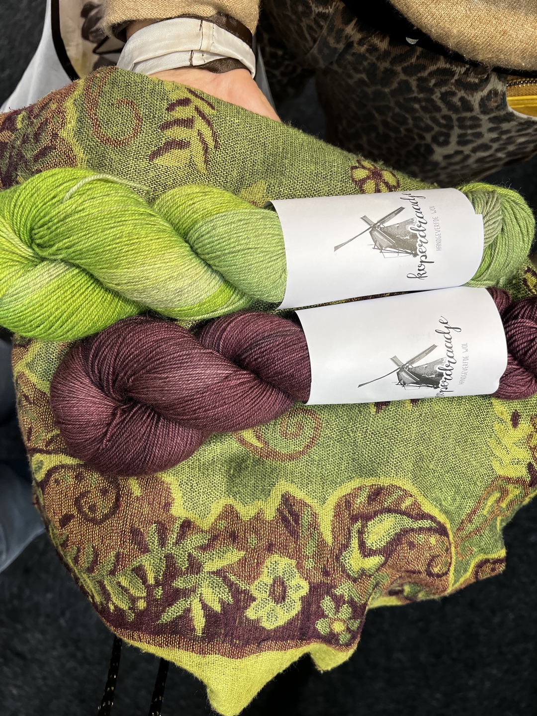 De shawl waar de wol op ligt had deze mevrouw mee genomen omdat ze die combinatie heel erg mooi vond en graag een trui in deze kleuren wilde breien.
