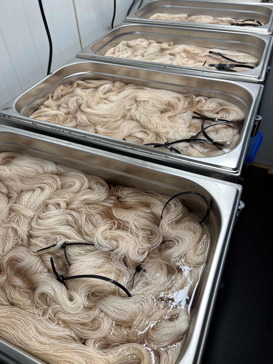 De eerste strengen zijn al geverfd en er wordt door Jannie een mooi nieuw voorbeeld gebreid van een trui in mooie non superwash 100% Lama wol.