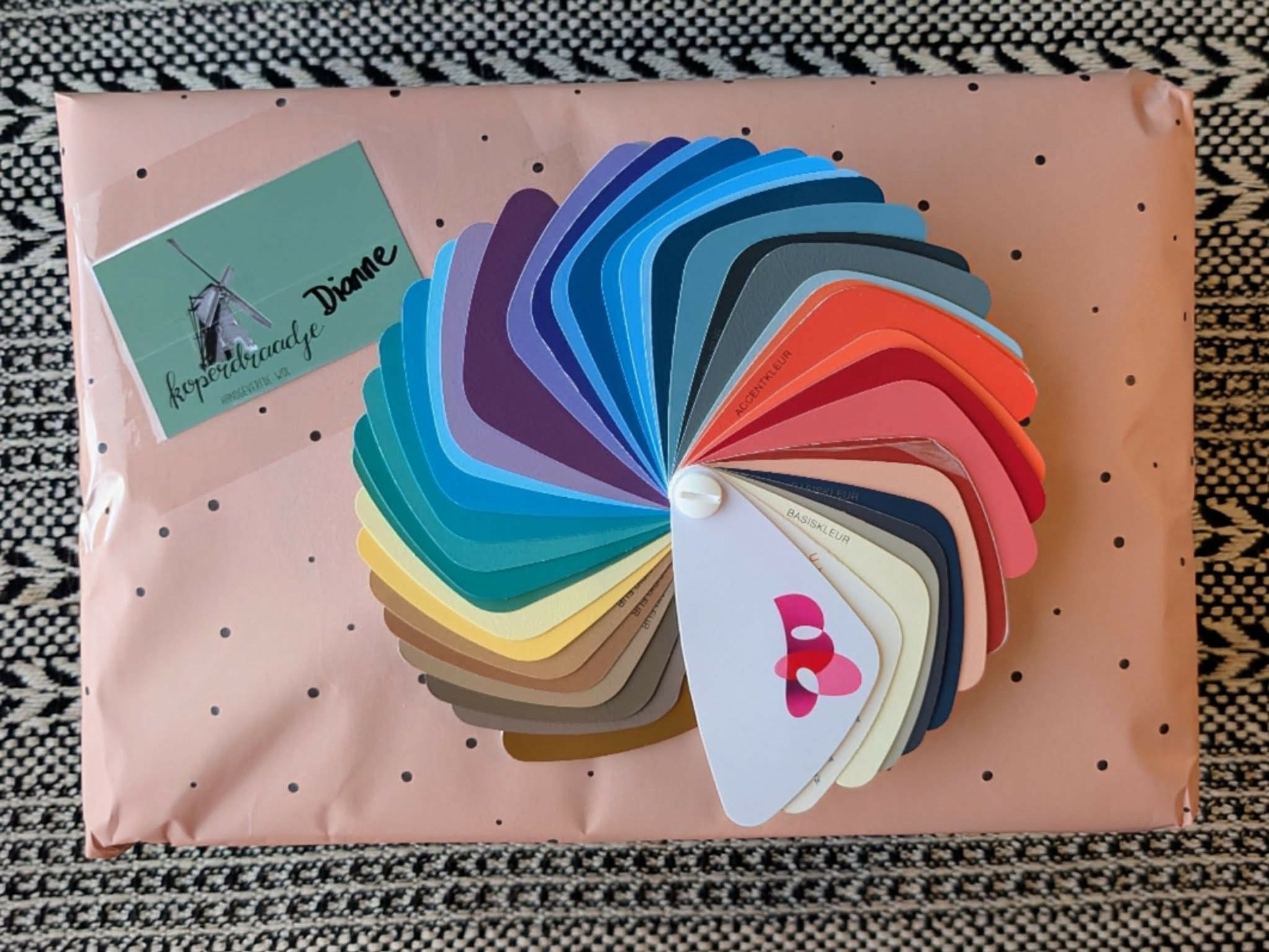 Ik mocht haar kleurenwaaier die zij van haar kleurenconsulente had gekregen gebruiken. Ze had ook een patroon van een truitje aan mij gegeven waar ze de wol voor wilde gebruiken.